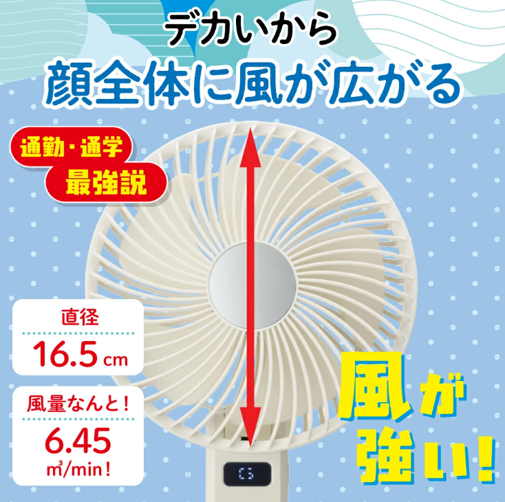 一般的なハンディファンよりも大きな直径約16.5cmのファンを採用しています。